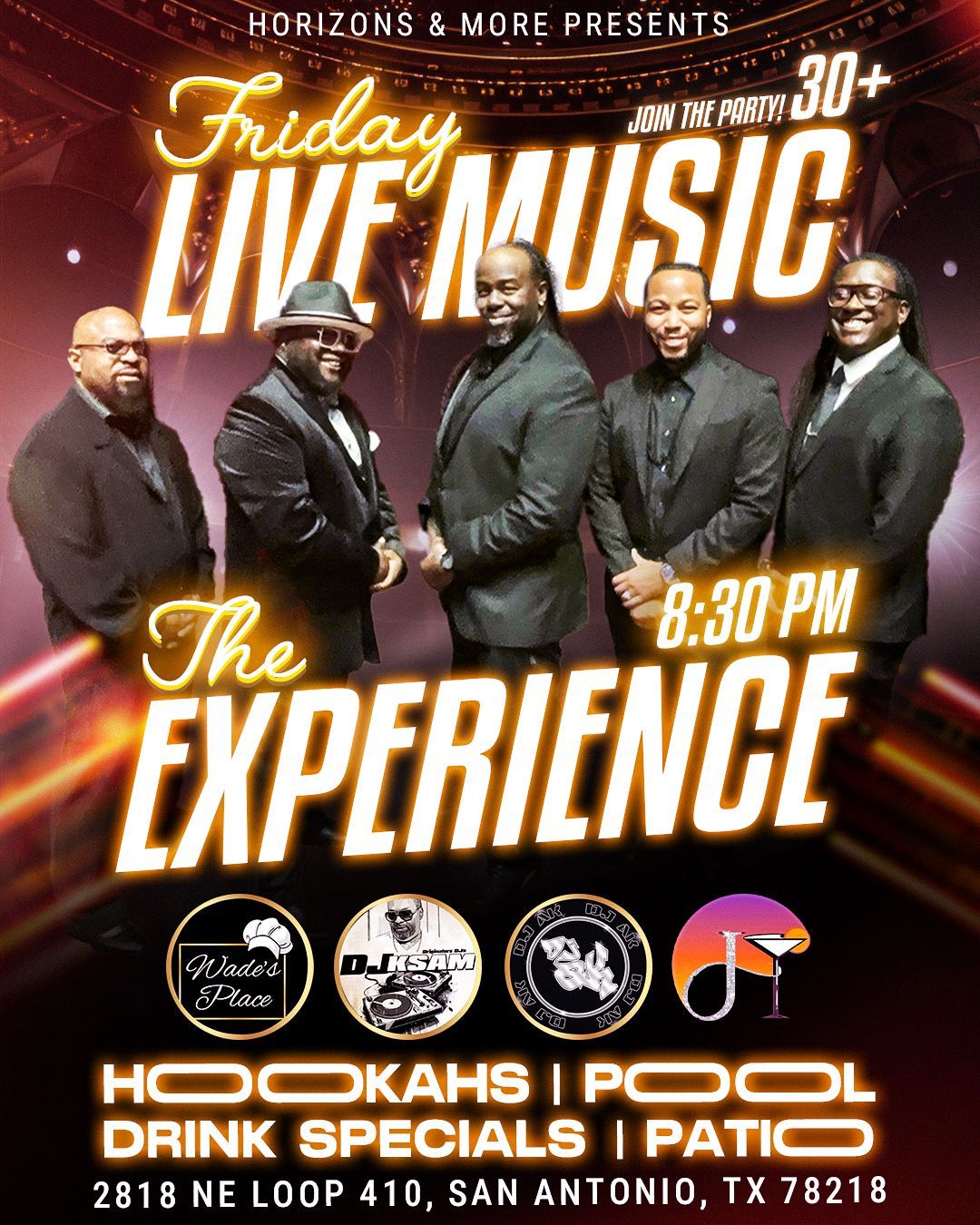 Our live music is 8:30-11:30 pm. The first and third Fridays feature The Experience.